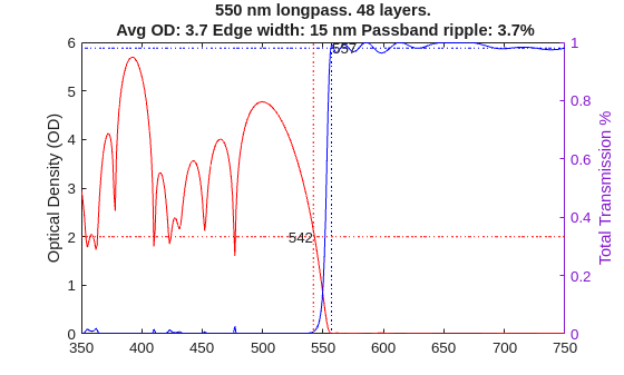 Figure contains an axes object. The axes object with title 550 nm longpass. 48 layers. Avg OD: 3.7 Edge width: 15 nm Passband ripple: 3.7%, ylabel Total Transmission % contains 8 objects of type line, text.