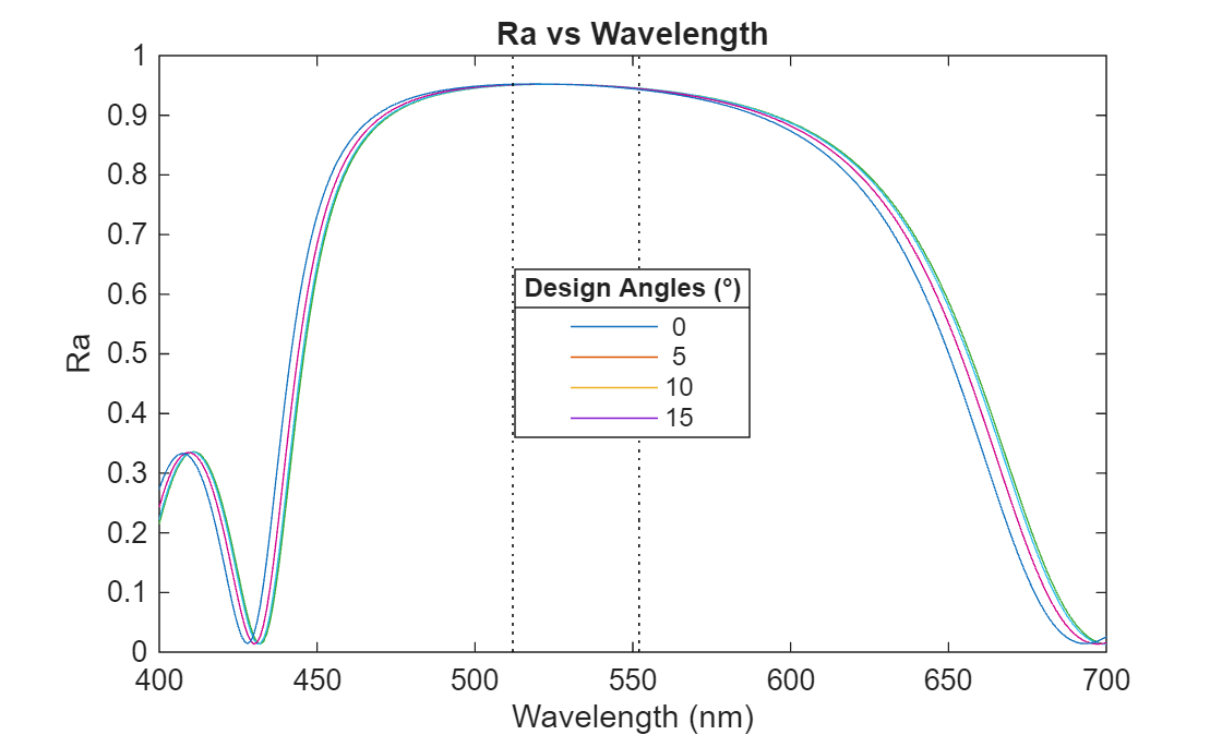 fq = fresnelCoefficients(oc, ... Wavelengths=dispWavelength,IncidentAngles=design.Angles); plot(dispWavelength,fq.Ra'); hold on; plot([oc.WavelengthRange(1),oc.WavelengthRange(1)],[0 1],"k:"); plot([oc.WavelengthRange(2),oc.WavelengthRange(2)],[0 1],"k:"); title("Ra vs Wavelength") l1 = legend(num2str(design.Angles'),Location="best"); xlabel("Wavelength (nm)"); ylabel("Ra"); title(l1,"Design Angles (°)")