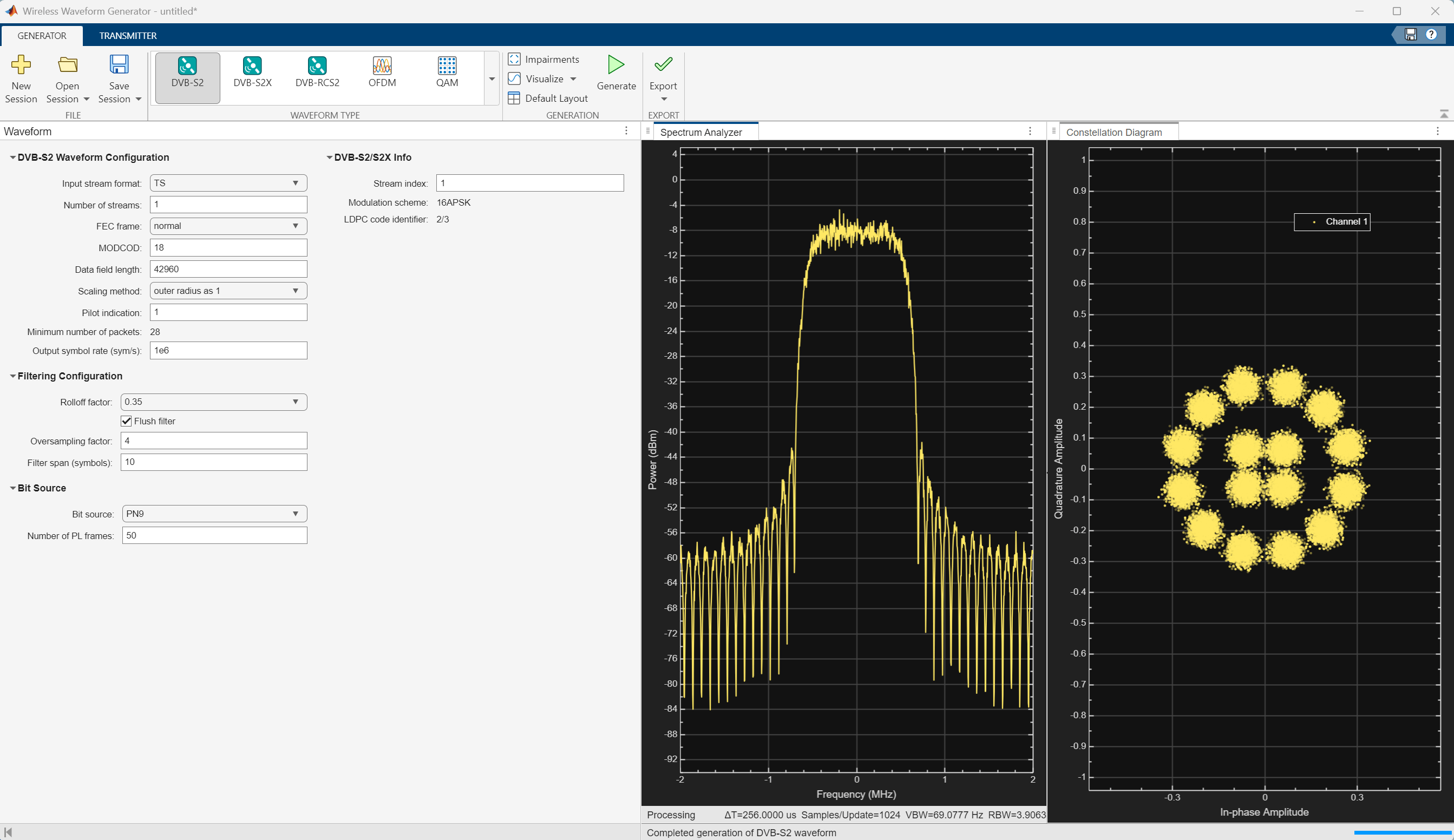 In the Waveform Type section, click DVB-S2. Digital Video Broadcasting Satellite Second Generation (DVB-S2) is a physical layer standard to support high-data-rate satellite communications in space.