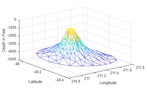 figure hidden on trimesh(tri,x,y,z) xlabel("Longitude") ylabel("Latitude") zlabel("Depth in Feet")