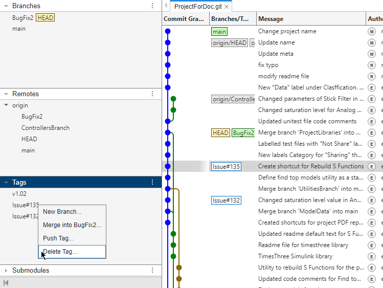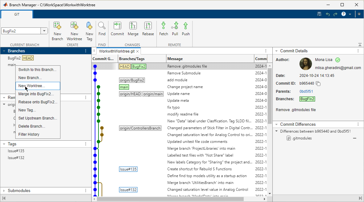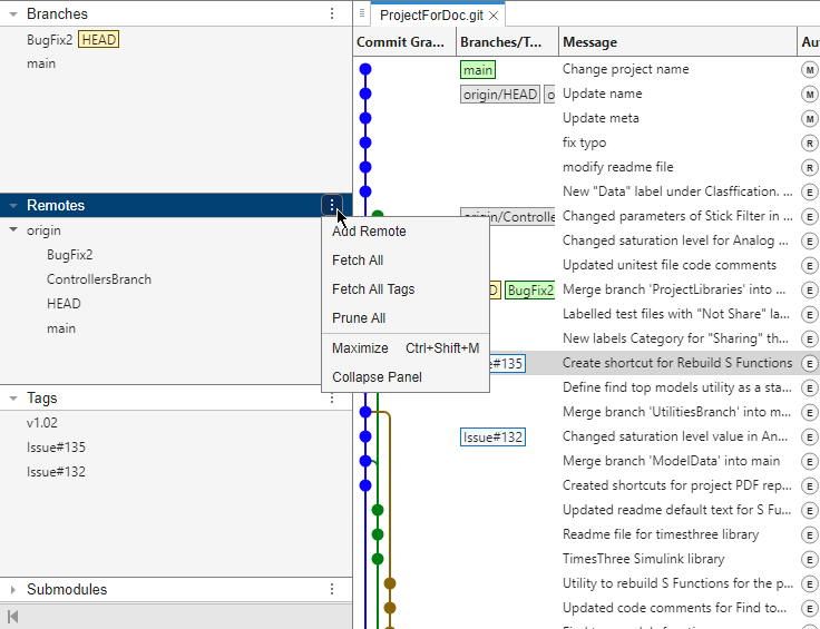 View Git repository history and manage local and remote Git branches and repositories