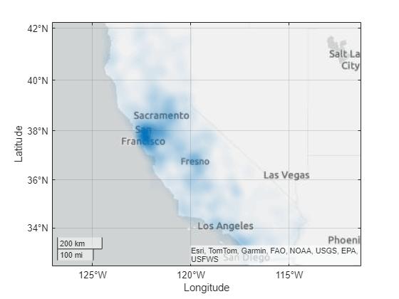 geodensityplot(___, 使用一个或多个名称-值参量指定密度图的属性。有关属性列表,请参阅 DensityPlot 属性。 Name=Value)