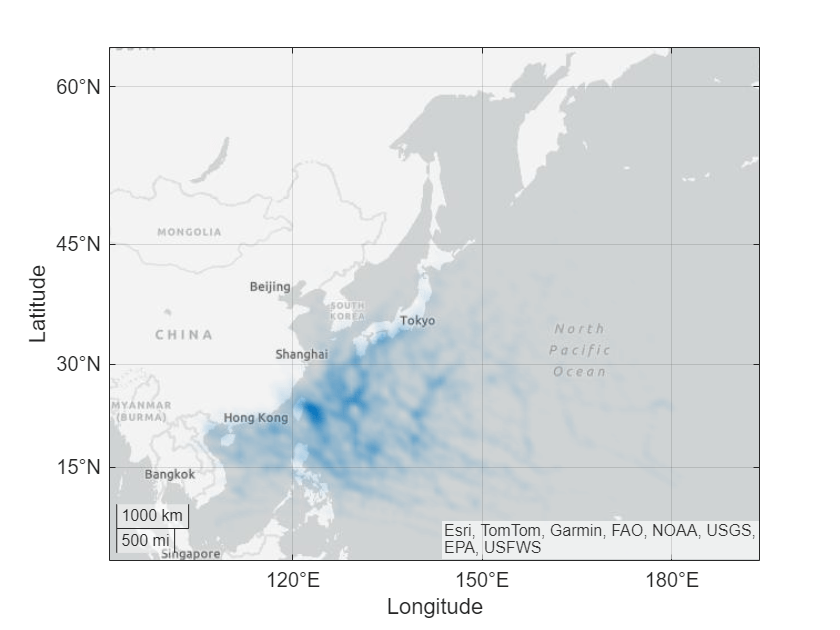 geodensityplot( 在 gx,___)gx 指定的地理坐标区中绘图。将坐标区指定为第一个参量,后跟上述语法中的任何输入参量组合。