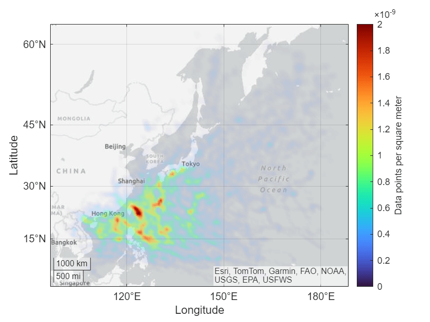 密度图是具有不同透明度的曲面。geodensityplot 函数通过计算指定点的累积概率分布并根据点的密度改变透明度来创建曲面。