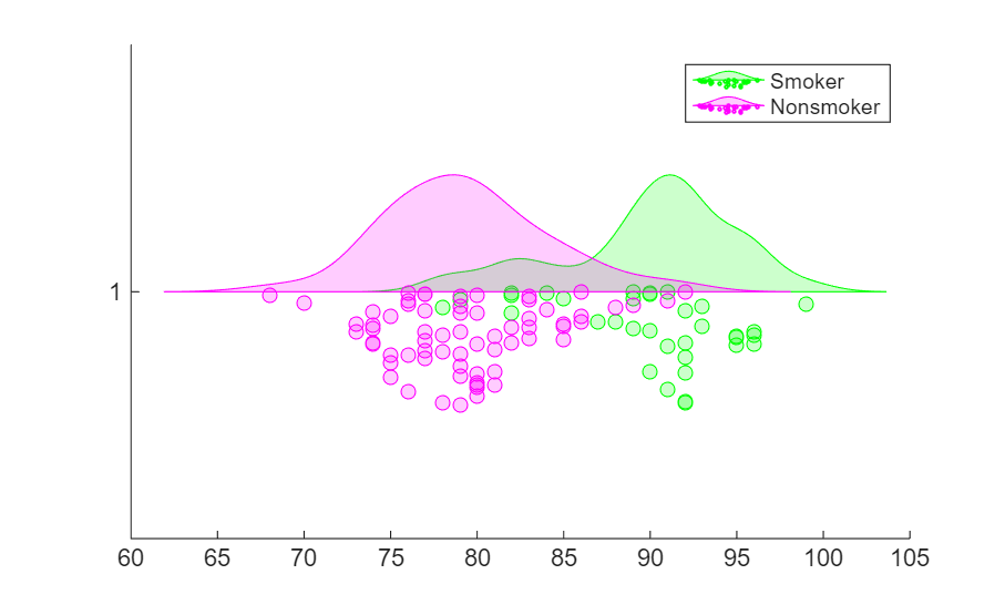 r2 = raincloudplot(diastolicNonSmoker);You can modify the rain cloud plots by specifying the properties of the RainCloudPlot objects in r1 and r2. For more information, see RainCloudPlot Properties.