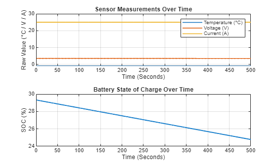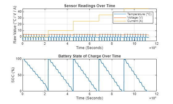 SOC represents the remaining charge of an electric battery as a percentage of its total capacity. This example uses experimentally characterized data collected from a battery at five different ambient temperatures. The obtained data set has three input features, current, voltage, and temperature, and one output feature, SOC. In this example, you prepare this data set to train and test a long short-term memory (LSTM) neural network that predicts SOC based on the three input features.