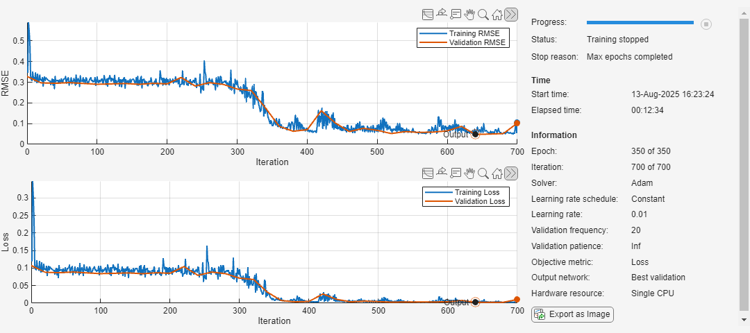 The network architecture and training settings in this section are optimized for the use case shown in this example. For guidance on customizing deep learning models and training strategies, see Train Deep Learning Network for Battery State of Charge Estimation (Deep Learning Toolbox).