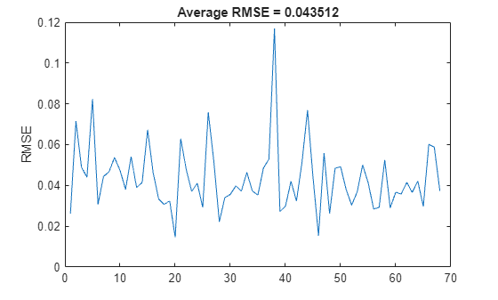 Visualize the RMSE for each validation sequence. A lower RMSE indicates higher prediction accuracy. The LSTM network used in this example has an average RMSE of about 0.0435.