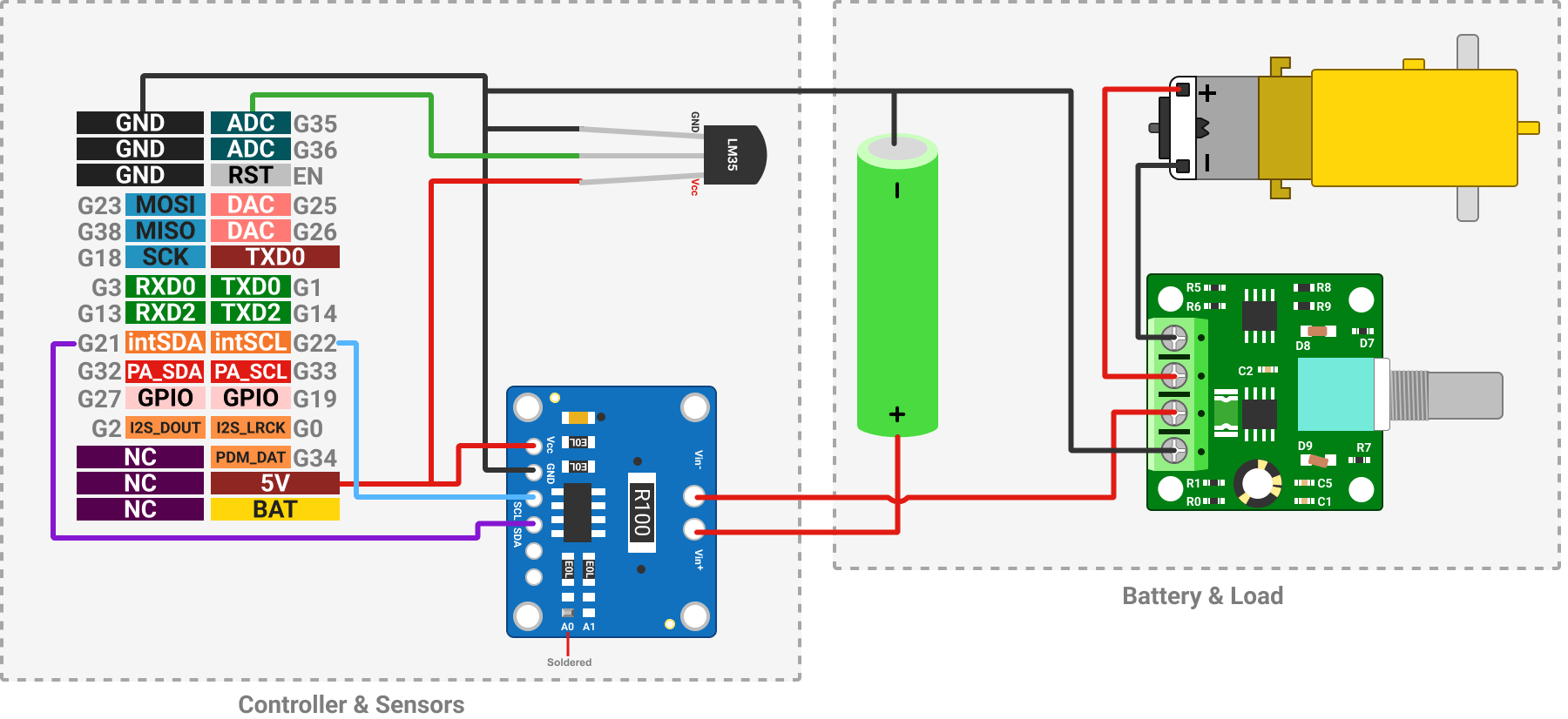 • Establish a common ground between the battery-powered load circuit and the sensors powered by the M5Stack Core2. To do so, connect the negative terminal of the battery, along with the GND pins of the temperature sensor, current sensor, and speed controller, to a GND pin on the M5Stack Core2.