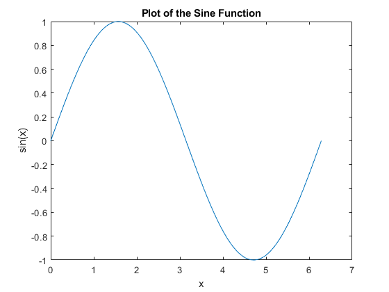 xlabel('x') ylabel('sin(x)') title('Plot of the Sine Function')