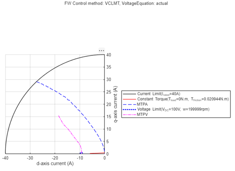 In the generated figure as shown below, observe the different constraints of the PMSM, such as current limit curve, voltage limit curve, constant torque curve, MTPA curve and MTPV curve.