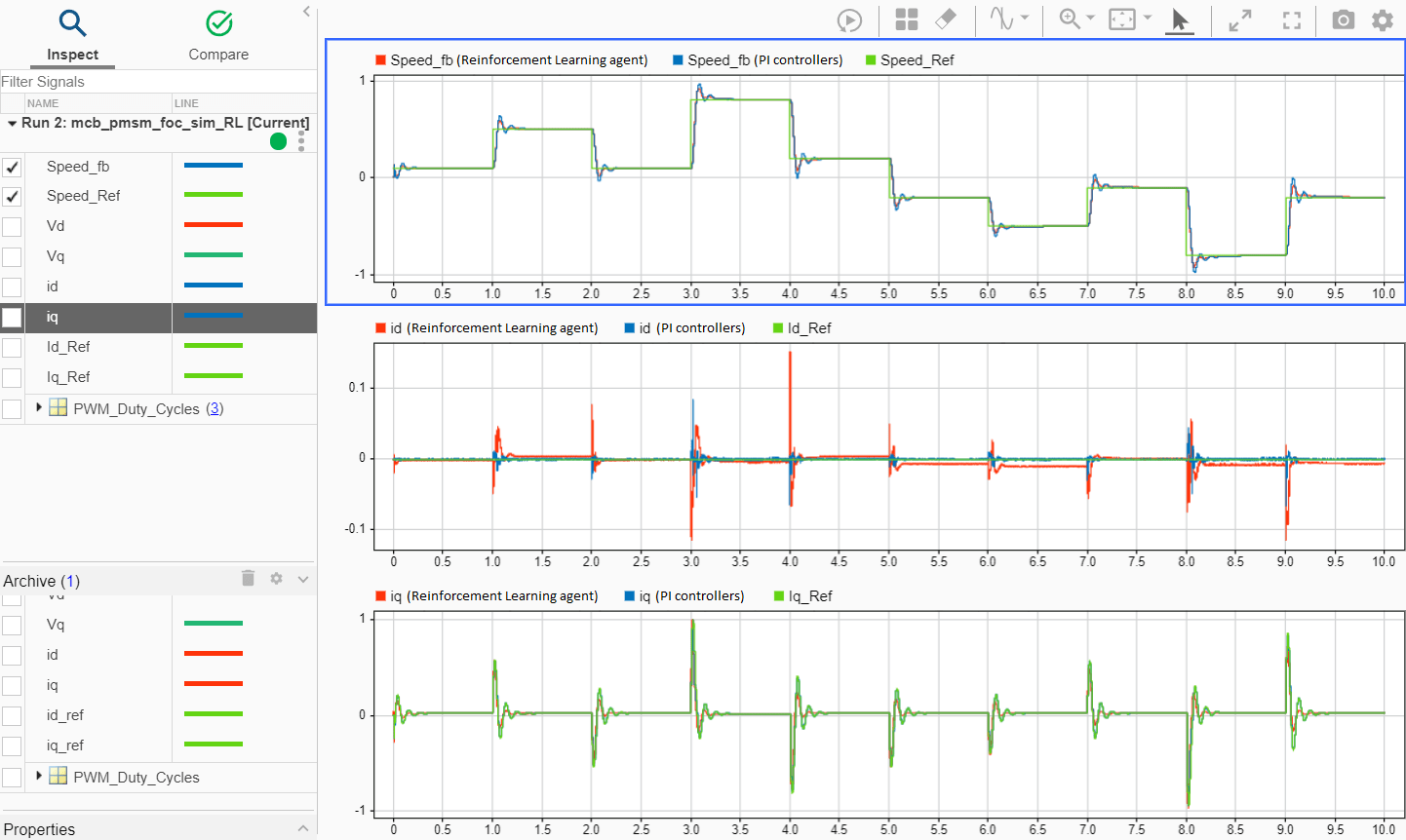 第二个和第三个数据检查器图显示,经过训练的强化学习智能体充当电流控制器并能成功跟踪