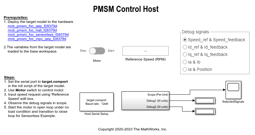 此示例使用一个主机模型和一个目标模型。主机模型是控制器硬件板的一个用户界面。您可以在主机上运行主机模型。使用主机模型的前提条件是将目标模型部署到控制器硬件板上。主机模型使用串行通信对目标 Simulink® 模型发出指令,并以闭环控制方式运行电机。