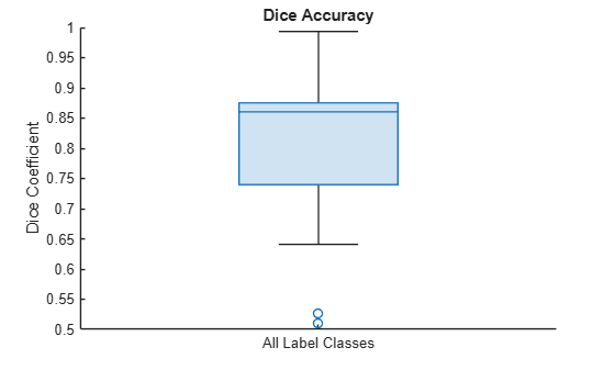 Visualize statistics about the Dice indices across all the label classes as a box chart. The middle blue line in the plot shows the median Dice index. The upper and lower bounds of the blue box indicate the 25th and 75th percentiles, respectively. Black whiskers extend to the most extreme data points that are not outliers.