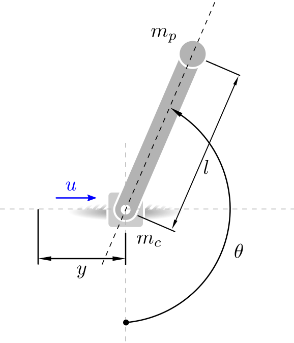 The cart-pole system consists of a cart that can move horizontally and a pendulum (that is, a pole) mounted on the cart, free to swing in the vertical plane. The control input is the horizontal force applied to the cart, u. Since the pendulum is not directly actuated, the system is underactuated.