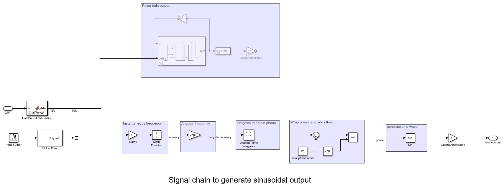 set_param(gcb, 'LinkStatus', 'none')to make the block editable.The original Ring Oscillator VCO from Mixed-Signal Blockset™ outputs a pulse train whose frequency depends on the control voltage. To generate a sine wave, the process involves:Computing instantaneous frequency from the half-period.