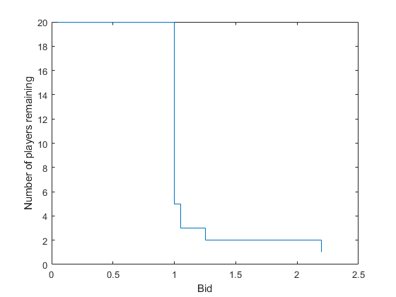 playersRemaining = nPlayers - cumsum(numberDropouts); stairs(incr*epochs,playersRemaining) xlabel('Bid') ylabel('Number of players remaining')