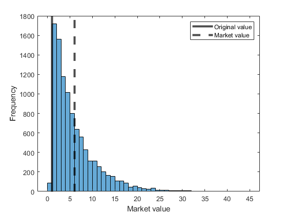 histogram(B); origLine = xline(1,'k','LineWidth',3); marketLine = xline(mean(B),'k--','LineWidth',3); xlabel('Market value') ylabel('Frequency') legend([origLine, marketLine],{'Original value','Market value'},'Location','NorthEast')