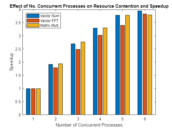 bar(speedup) legend('Vector Sum', 'Vector FFT', 'Matrix Mult.', ... 'Location', 'NorthWest') xlabel('Number of Concurrent Processes'); ylabel('Speedup') title(['Effect of No. Concurrent Processes on ', ... 'Resource Contention and Speedup']);