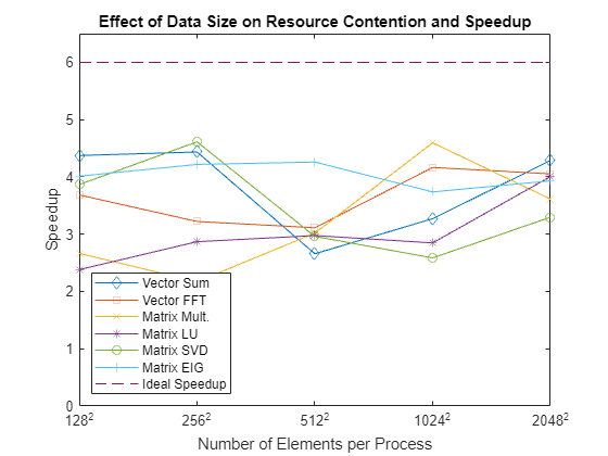 speedup = zeros(length(szs), length(operations)); % Loop over the data sizes for i = 1:length(szs) sz = szs(i); fprintf('Using matrices of size %d-by-%d.\n', sz, sz); j = 1; % Loop over the different operations for f = [{@sumOp; sz^2; 1}, {@fftOp; sz^2; 1}, {@multOp; sz; sz}, ... {@lu; sz; sz}, {@svd; sz; sz}, {@eig; sz; sz}] op = f{1}; nrows = f{2}; ncols = f{3}; m = rand(nrows, ncols); % Compare sequential execution to execution on all workers tcurr = timingFcn(@() op(m), [1, poolSize]); speedup(i, j) = tcurr(1)/tcurr(2)*poolSize; j = j + 1; end end