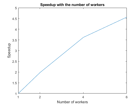 f = figure; speedup = tLocal(1)./tLocal; plot(numWorkers, speedup); title('Speedup with the number of workers'); xlabel('Number of workers'); xticks(numWorkers); ylabel('Speedup');