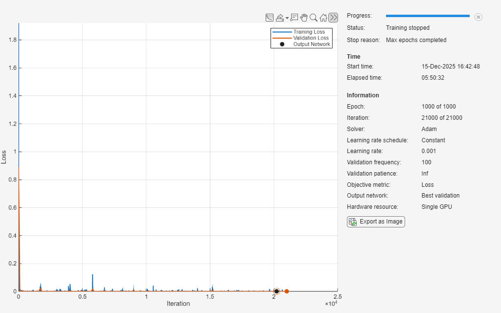 This step can take a long time to run. Using an NVIDIA Titan RTX with 24 GB of memory, the neural network takes about 6 hours to train. The example downloads the trained network. To train the network, set the doTraining variable to true.