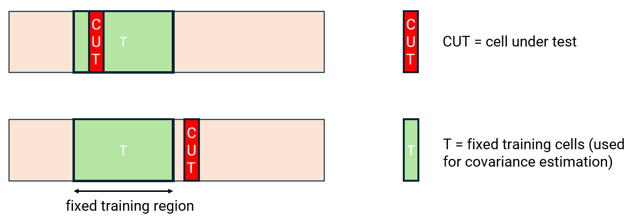 Training cells dynamically adjust with the CUT position, maintaining a symmetric window around it. Guard cells isolate the CUT from training regions to prevent contamination. This method ensures target-free training and the proximity of training cells to the CUT improves noise covariance accuracy. However, this method leads to higher computational cost in the ACE detector due to repeated covariance updates for each CUT.