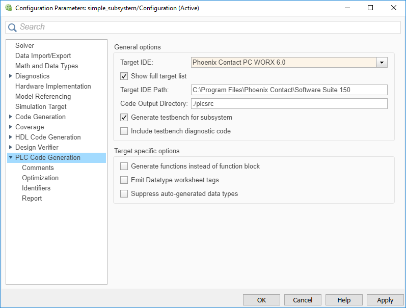 Alternatively, you can right-click the Subsystem block and select PLC Code > Options.