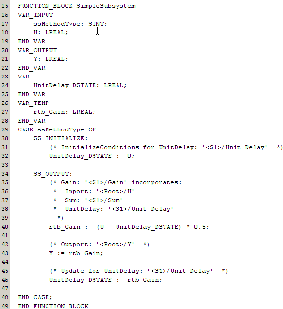 After generating the code, you can view it in the MATLAB Editor. For a description of how the generated code for the Simulink components map to Structured Text components, see Verify Generated Code by Using Code Tracing. In addition, note the following: