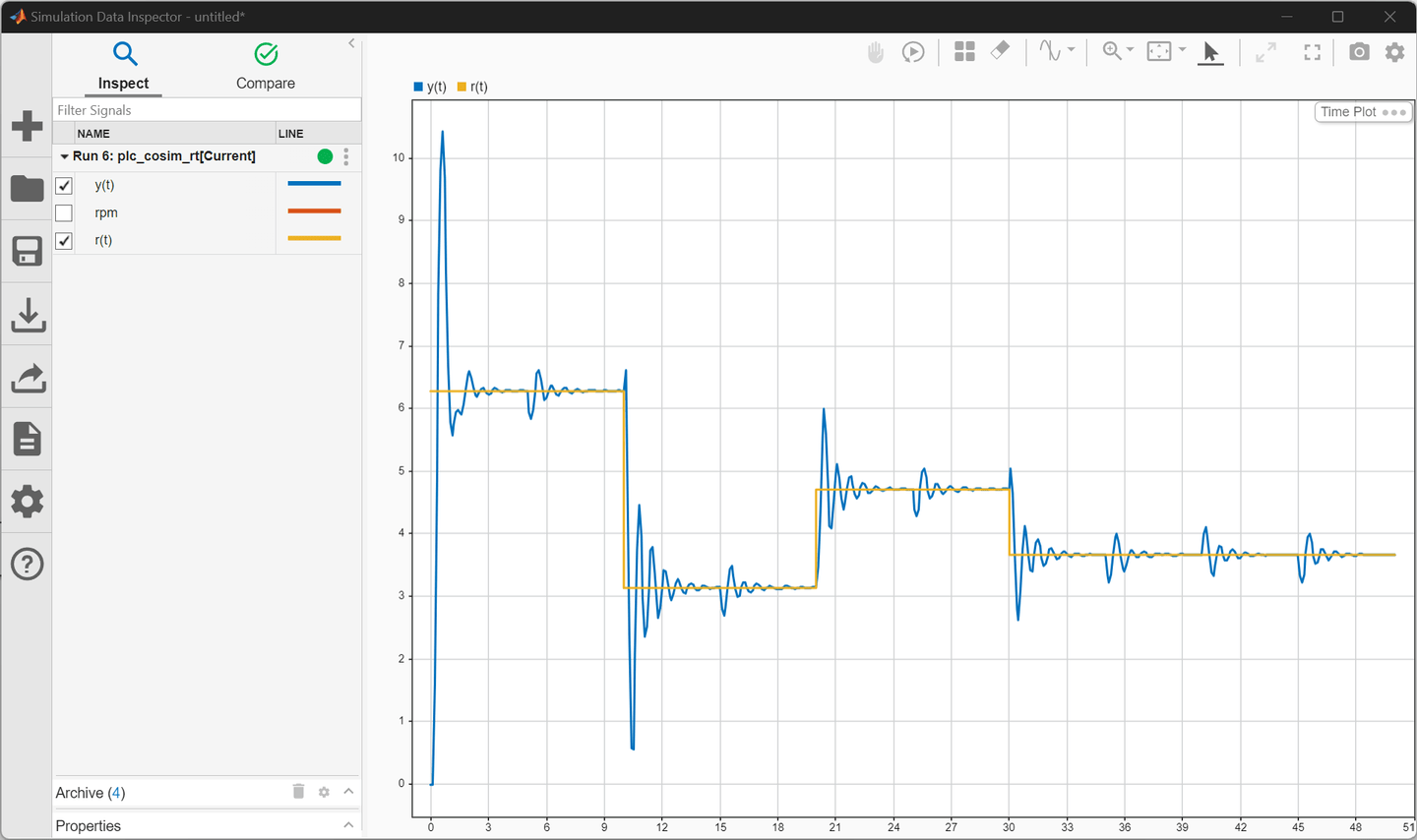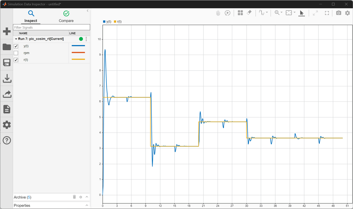 After the Simulink model simulation ends, in CODESYS, click Debug > Stop. In Simulink, in the Simulation tab, in the Review Results section, click Data Inspector. Select r(t) and y(t) to observe the co-simulation results.