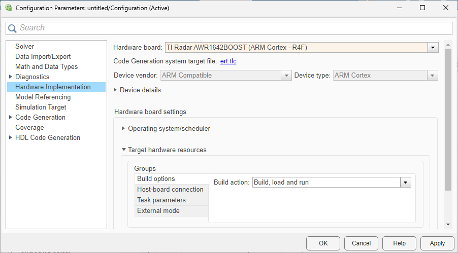 TI Radar AWR1642BOOST (ARM Cortex - R4F).The parameter values under Hardware board settings are automatically populated to their default values.