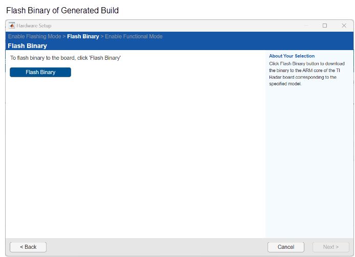 12. After the executable is created, the Simulink window becomes non-interactive and the Hardware Setup windows appear instead, which provide the step-by-step instructions to set the flashing mode of TI mmWave radar board, flash the binary of the generated build, and then return to functional mode. This process also involves changing the switch positions on the board, as described in the instructions. After completing each step, click Next on the window to proceed.