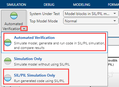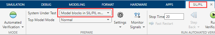 11. On the SIL/PIL tab in Simulink, click either Run Verification or Run SIL/PIL according to the Mode that you selected.