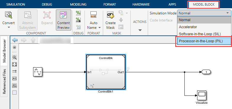 3. Select the referenced model, and on the Model Block tab, set Simulation Mode to Processor-in-the-loop (PIL).