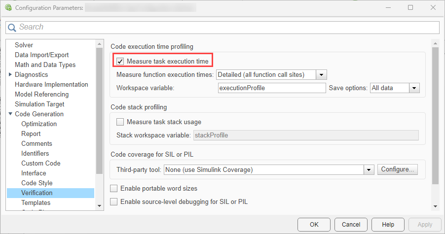 7. If required, configure the simulation to produce execution-time metrics for tasks and functions in your generated code (see Create Execution-Time Profile for Generated Code (Embedded Coder)).