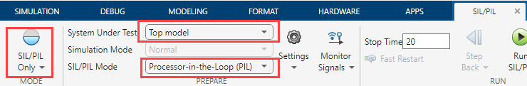 5. Set the Mode in SIL/PIL tab to SIL/PIL Simulation Only.
