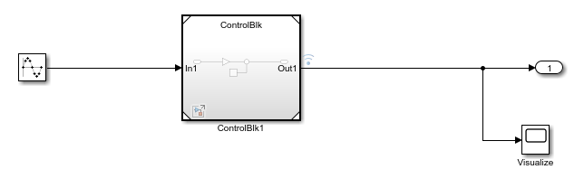 1. Create a Simulink model with the control logic represented in a referenced model. For example, consider this model that contains a referenced model named ControlBlk.