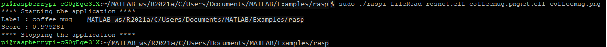 In this example, coffeemug.png is the image input to the executable and the location of the executable is /home/pi/MATLAB_ws_R2021a/C/Users/Documents/MATLAB/Examples/rasp.