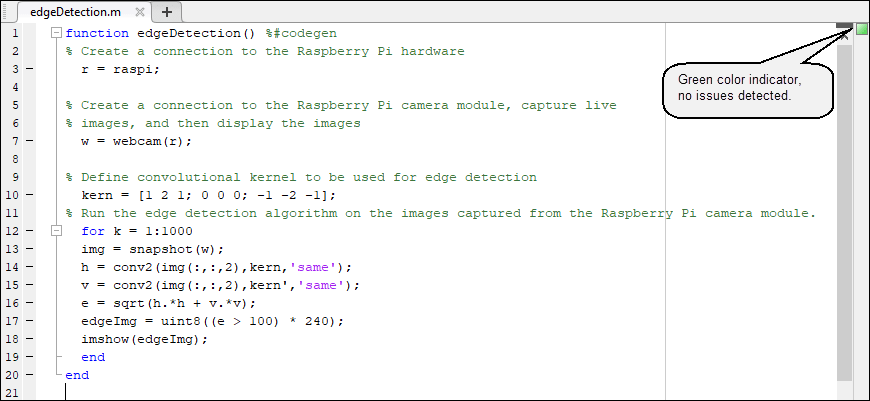 Add the %#codegen directive (or pragma) after the edgeDetection function signature to indicate that you intend to deploy the function on the hardware. Adding this directive instructs the MATLAB Code Analyzer to help you diagnose and fix violations that would result in errors during deployment.