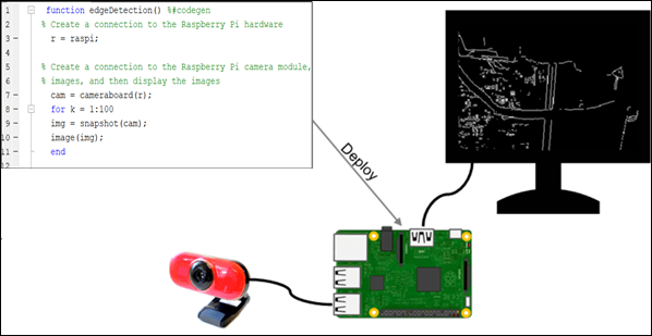 This example shows you how to deploy an Edge detection function on the Raspberry Pi® hardware as a standalone executable using Raspberry Pi Blockset. In this example, you will learn how to acquire live image from a webcam connected to the Raspberry Pi hardware, run the edge detection function on the acquired image, and display the result on the monitor that is connected to the same Raspberry Pi hardware.