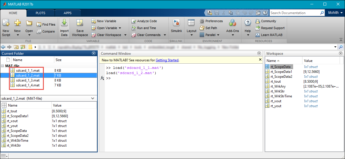 sdcard. In the first run, Simulink createssdcard_1_1.matfile and starts logging data in this file. After the logging in the first file is completed, Simulink createssdcard_1_2.matfile and continues logging data in this file. Likewise, the logging continues in multiple MAT files until the Simulation stop time is elapsed. If the same model is run again, the new files are named assdcard_2_1.mat,sdcard_2_2.mat, and so on.Note