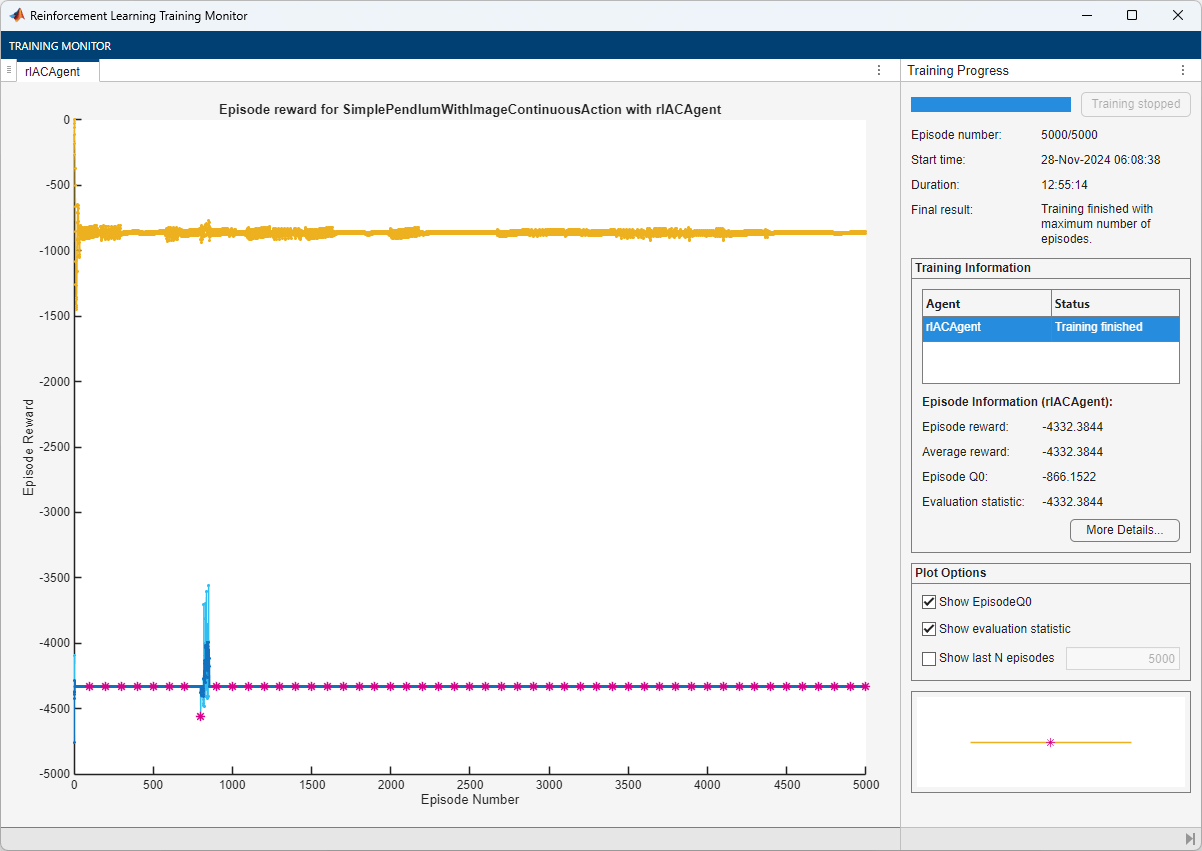 • To have a better insight on the agent's behavior during training, plot the training progress (default option). If you want to achieve faster training times, set the Plots option to none.