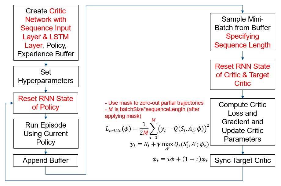 The figure below summarizes the workflow for training the agent. The red text highlights steps that are specific to LSTM networks.