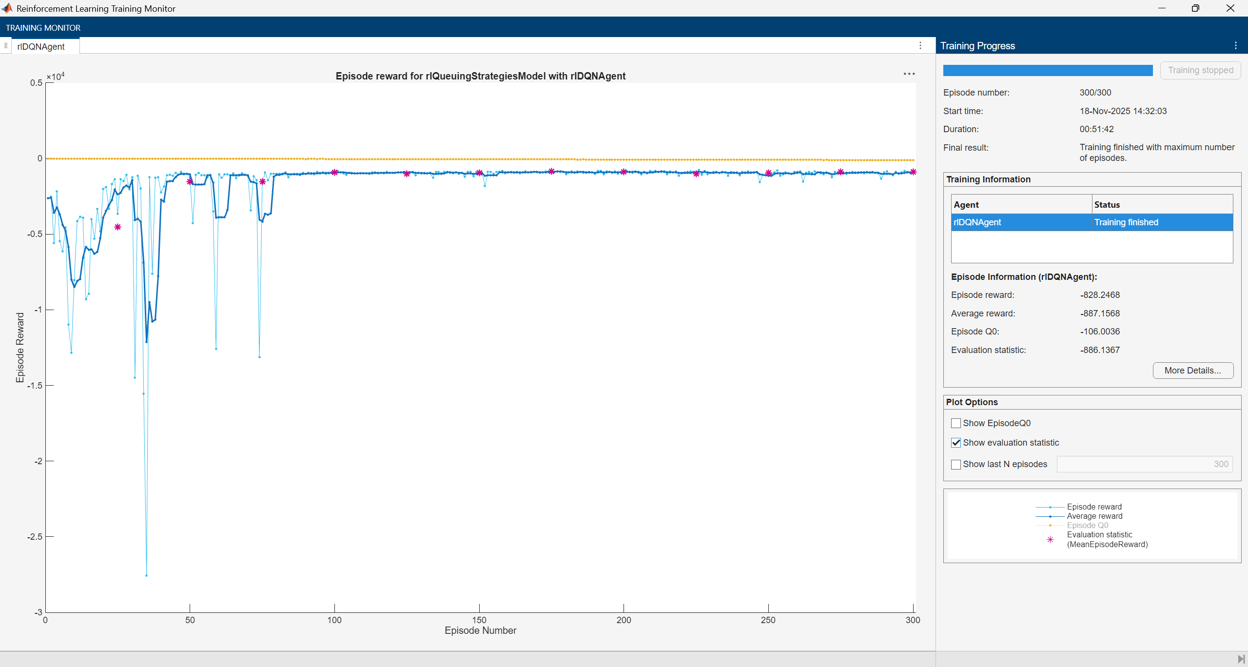 % Training options trainOpts = rlTrainingOptions(... MaxEpisodes=300, ... MaxStepsPerEpisode=1000, ... Verbose=false, ... Plots="training-progress",... StopTrainingCriteria="EvaluationStatistic", ... StopTrainingValue=0);