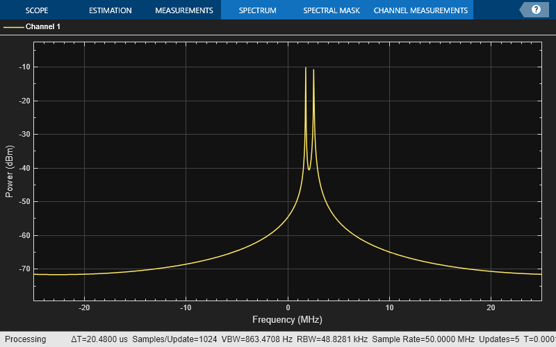 SpectAnal = spectrumAnalyzer('SampleRate',sampleRate,'ShowLegend',true); for Iter = 1:10 sineWave1 = SineObj1(); sineWave2 = SineObj2(); sineIn = m40dB*(sineWave1 + sineWave2); ampIQ = preAmpIQ(sineIn); modIQ = mixerModIQ(ampIQ); paOut = powerAmp(modIQ*sqrt(50))/sqrt(50); SpectAnal(paOut); end