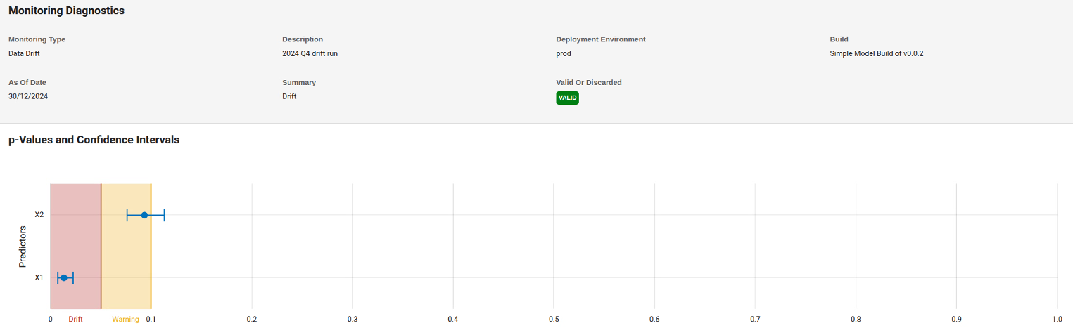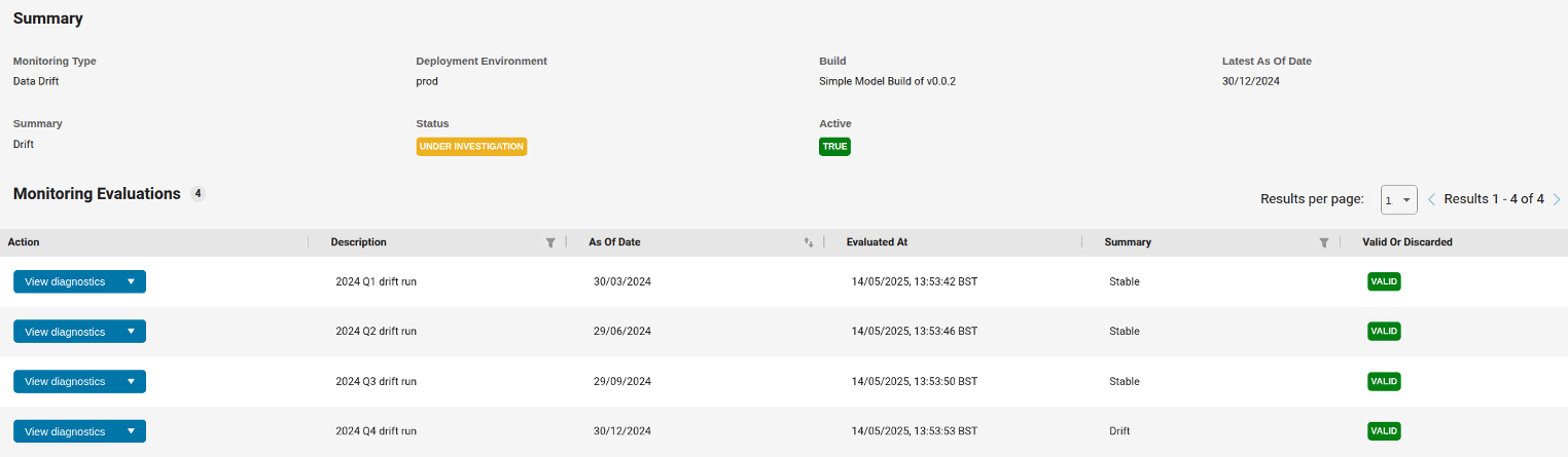 You see from the Summary column that the model was found to be Stable for the first three quarters of 2024, but is in a drifted state for the fourth quarter. To see more information about this run in the fourth quarter, click View Diagnostics. This opens the page with Monitoring Diagnostics.