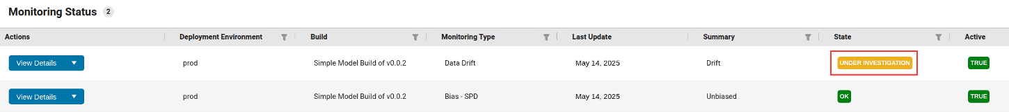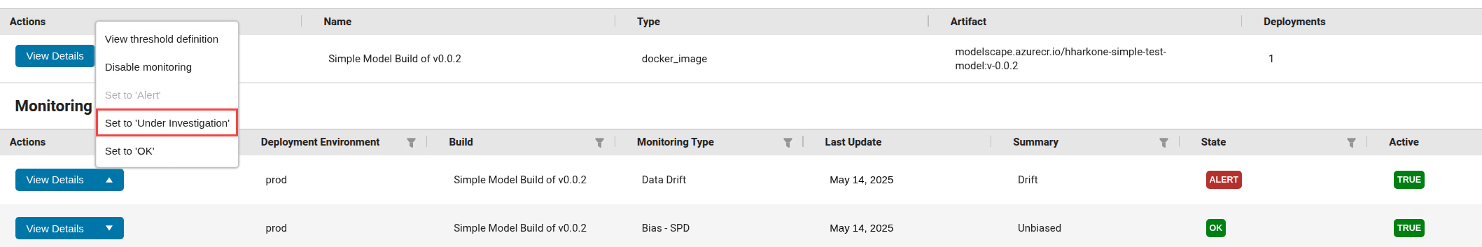 Start investigating the drift status by setting the state for data drift to Under Investigation. Click the drop-down arrow in the Actions column, then click Set to 'Under Investigation'.