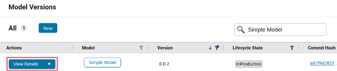 This example shows how to view the Monitoring Status of a model deployment in Modelscape. Navigate to the Model Versions page and find your required model version using the search and filter tool. Then click View Details.