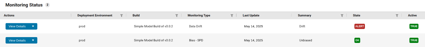 See that the production deployment of the model shows monitoring status with respect to two monitoring types: data drift and statistical parity difference (SPD). The table shows that the deployment is in an OK state with respect to SPD, but it is in Alert state for data drift. The right-hand column titled Active indicates that the model is actively monitored for these two monitoring types.