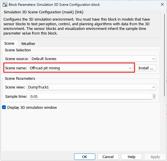 Default Scenes.Set the enabled Scene name parameter to Offroad pit mining scene.
